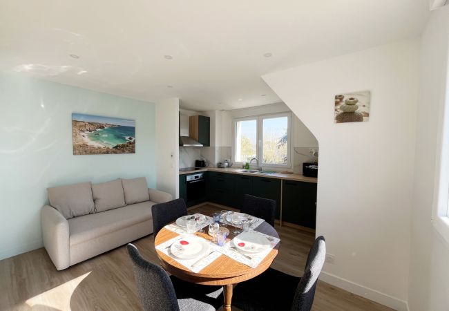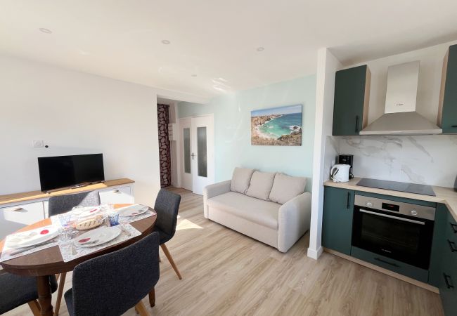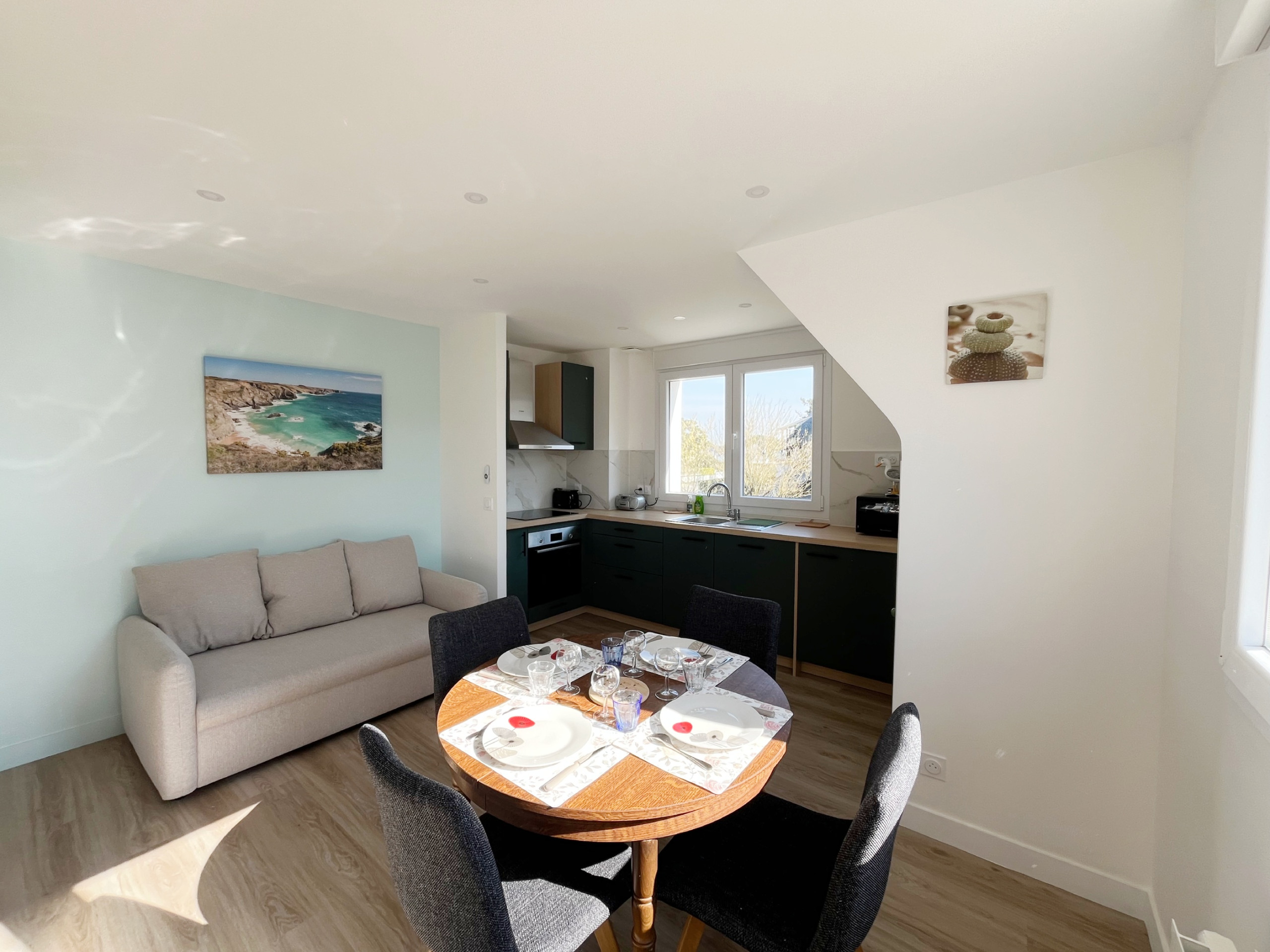 3-bedroom apartment of 49m² with sea view over Men-Dû cove. It includes: An entrance leading to a hallway with storage; Living room with sofa, television, table and chairs, storage cupboard, sea view; Open-plan equipped kitchen (oven, induction hob, extractor hood, fridge-freezer, dishwasher, microwave, kettle, coffee maker, toaster);