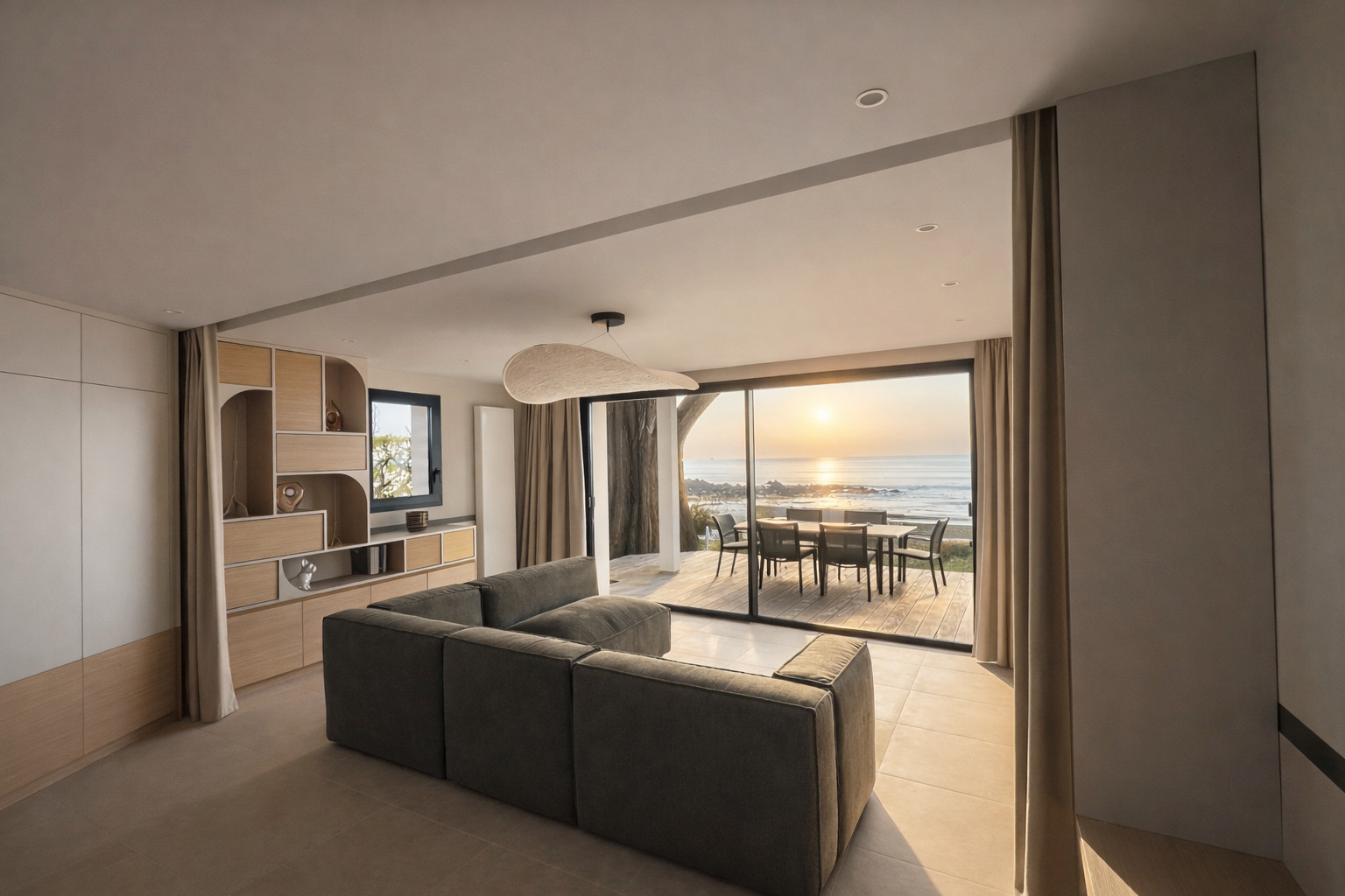 - Entrée sur pièce à vivre aménagée avec élégance, offrant une vue mer panoramique : espace salle à manger et salon avec télévision pouvant se transformer en coin nuit grâce à des rideaux occultants et un lit double escamotable de 160 cm. Une large baie vitrée donne sur la terrasse ;