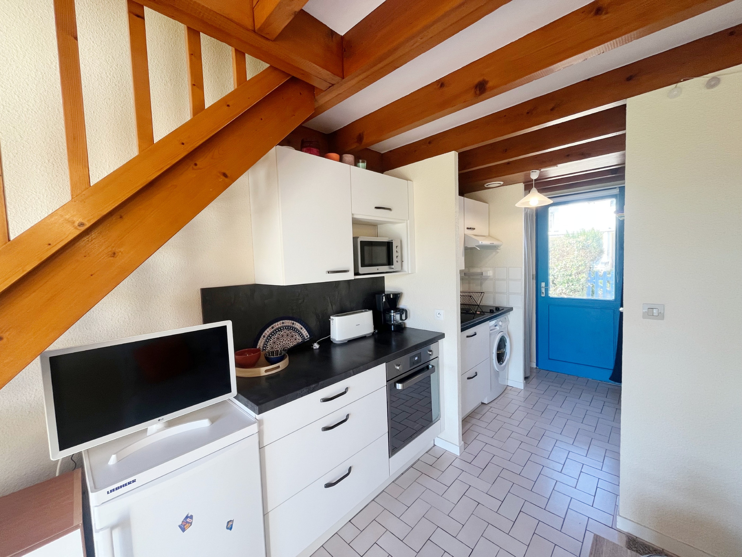- Un coin cuisine équipé (plaque de cuisson induction 3 feux, four, micro-ondes, réfrigérateur top, bouilloire, cafetière, grille-pain, lave-linge) ;