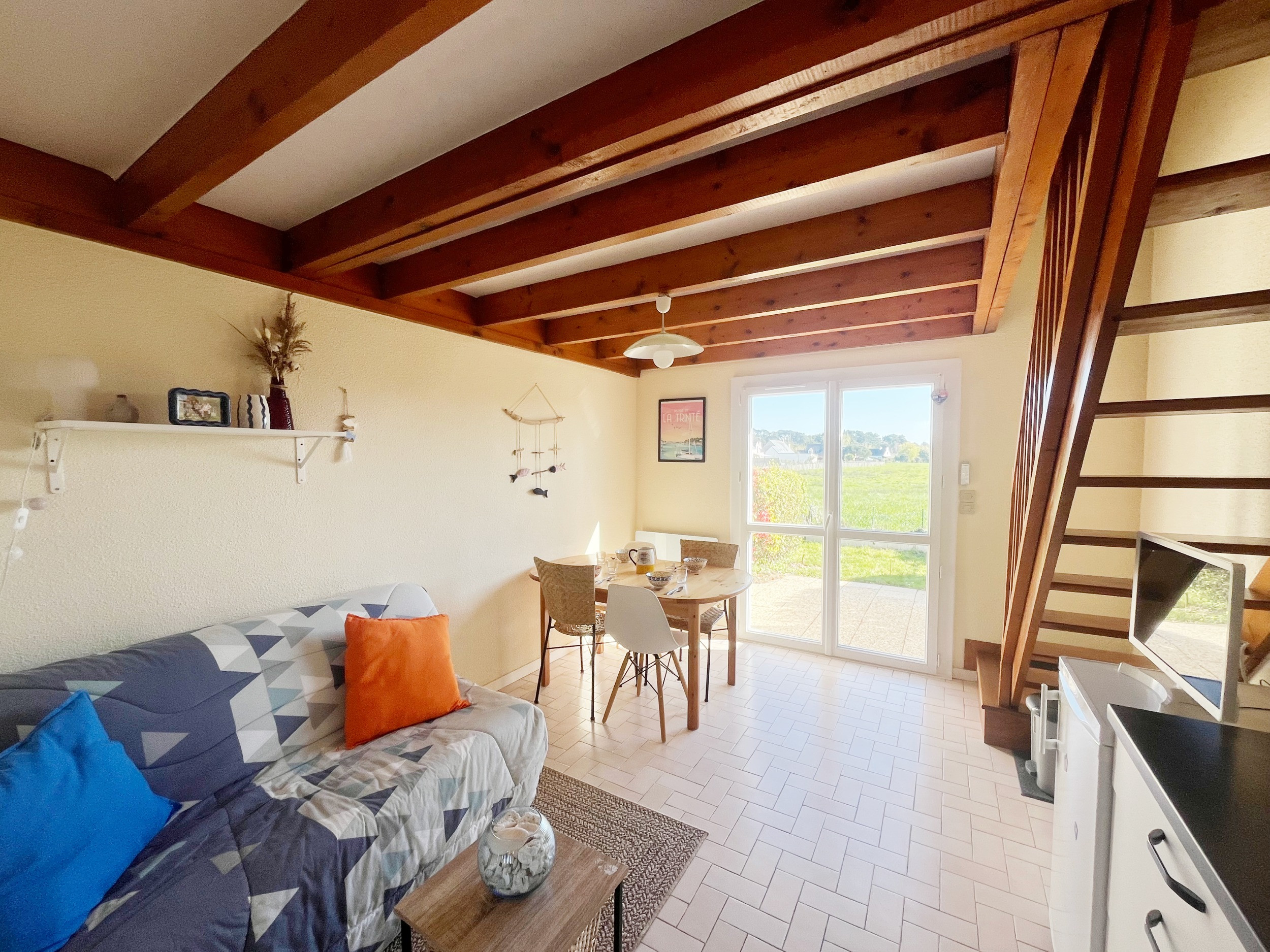 - Une pièce à vivre avec canapé convertible et télévision ;
