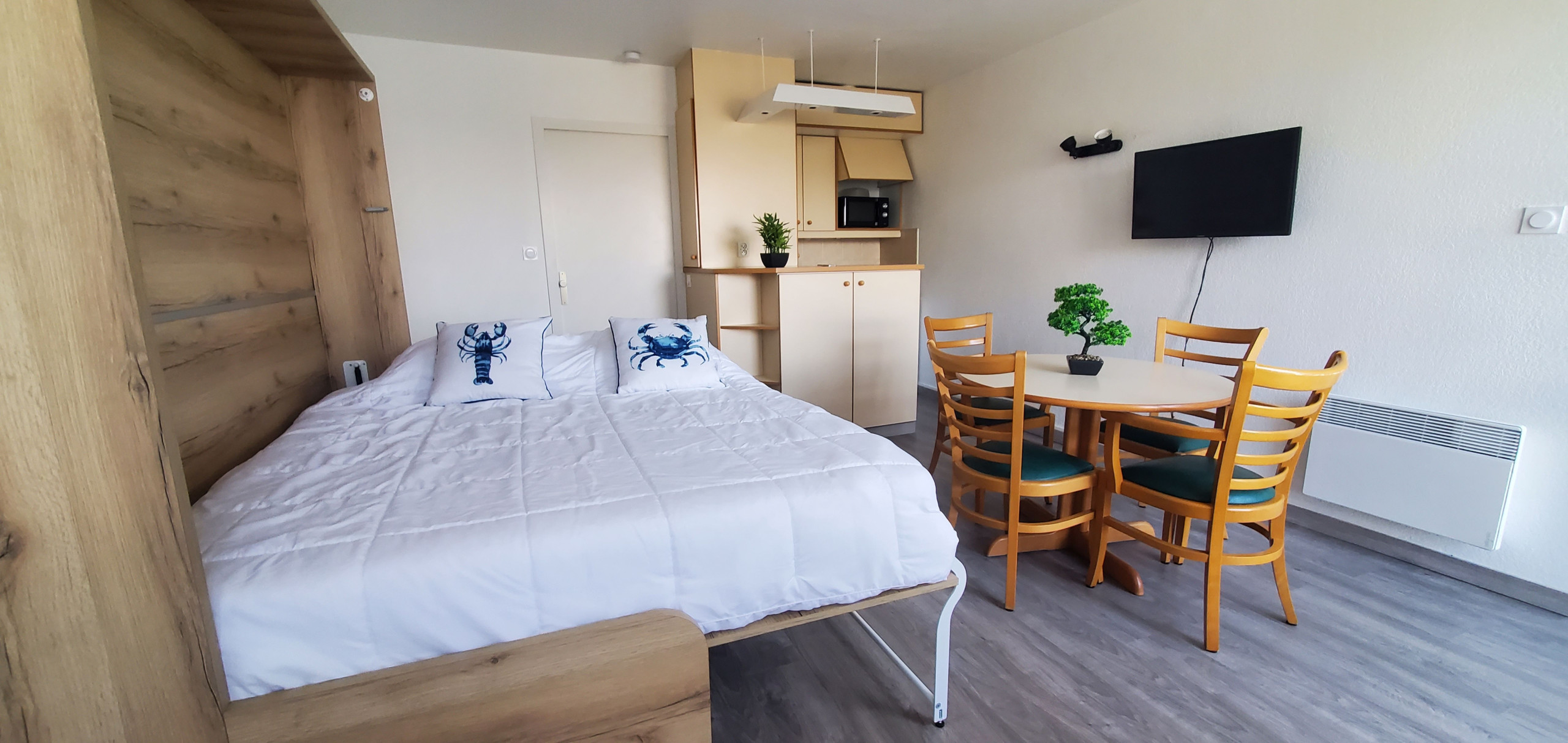 - Pièce de vie avec TV, 1 canapé-lit escamotable en 160 cm, table, chaises
