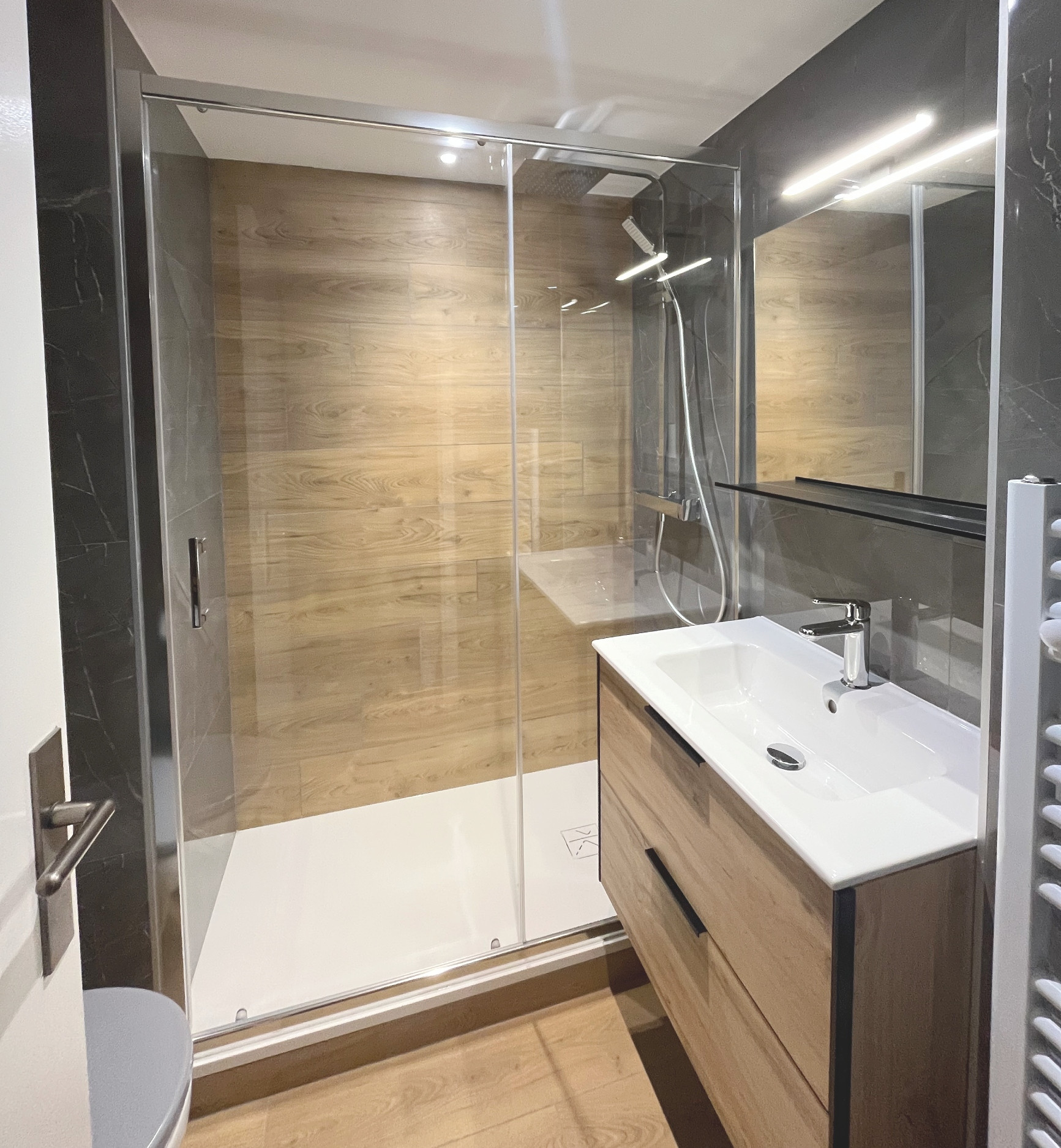 - Salle d'eau rénovée avec douche à l'italienne, lavabo 1 vasque, WC, rangements